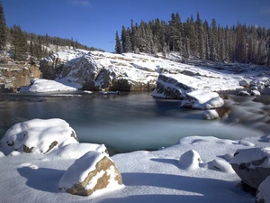 Snowy, winter, trees, viewes, Fance, grass, White frost, fence, Spruces