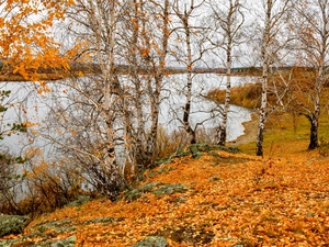 Stones, lake, viewes, rays of the Sun, trees, Mountains
