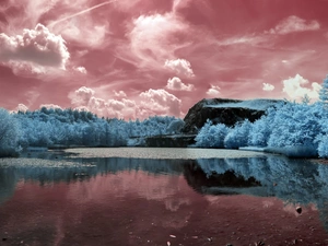 woods, lake, viewes, Stones, Mountains, trees, autumn