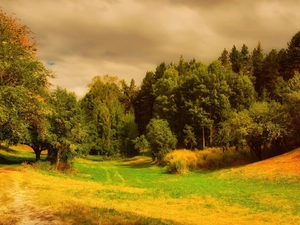 trees, Meadow, rays, sun, viewes, Flowers