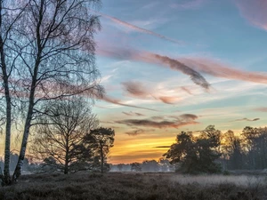 west, trees, lake, sun