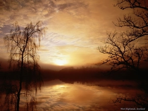viewes, reflection, Fog, grass, morning, trees, lake, Sunrise