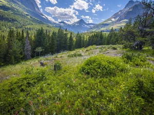 trees, viewes, Mountains, rays of the Sun, Sunrise