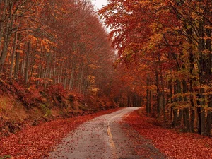 Sunrise, autumn, lake, Fog, trees, viewes, Platform, forest, wooden