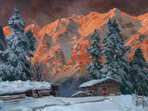 Houses, Val Gardena Valley, Dolomites, viewes, The Hills, Seiser Alm Meadow, Sassolungo Mountains, Italy, trees, Sunrise