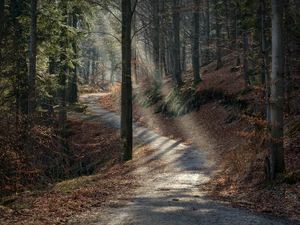 Fog, trees, Leaf, viewes, Lod on the beach, forest, autumn, mossy