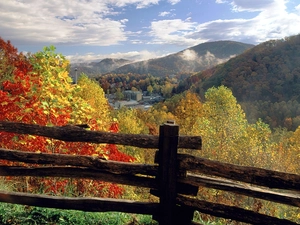 viewes, Mountains, Meadow, trees, River, woods, Railroad Tracks