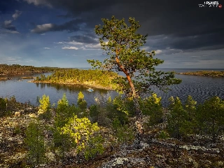 lake, Ladoga, Bush, rocks, viewes, Karelia, Russia, trees