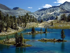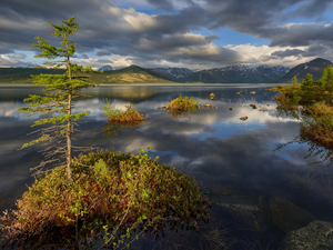 mount, River, clouds, Stones, viewes, illuminated, Mountains, trees