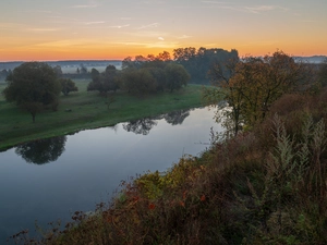 trees, mossy, rays of the Sun, Fog, viewes, Stones