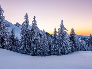 Fog, country, morning, Houses, viewes, Flowers, Meadow, trees