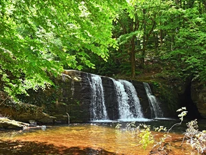 viewes, rocks, morning, trees, waterfall, forest, Fog