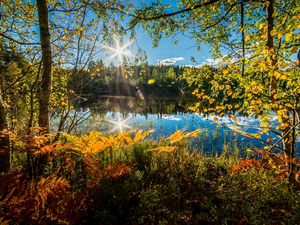 Mountains, Mount Rainier National Park, trees, viewes, Washington State, The United States, lupine, rays of the Sun, Flowers