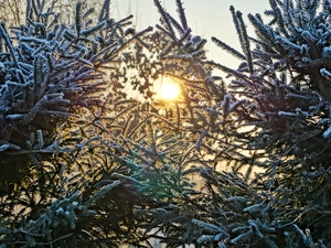 viewes, Fog, sun, trees, River, east, winter