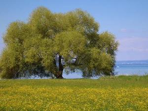 viewes, medows, sunny, trees, Mountains, Fog, day