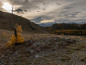 viewes, grass, Mountains, trees, Great Sunsets