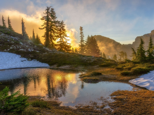 trees, autumn, grass, dark, rushes, River, Yellowed, clouds, viewes, Houses
