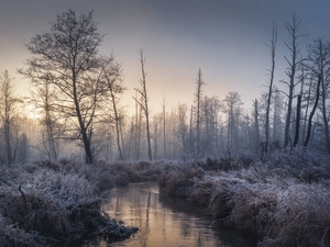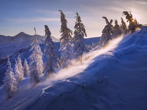 trees, Mountains, trees, rays of the Sun, winter, viewes, drifts