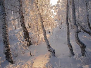 viewes, Bush, rays of the Sun, trees, winter, Mountains, Sunrise