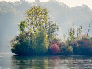 Mountains, Hill, Sunrise, trees, forest, Stones, River, viewes