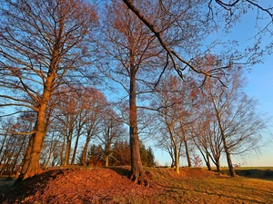 viewes, woods, rays of the Sun, trees, Mountains, Sunrise, clouds