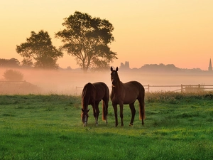 forest, Snowy, Sunrise, trees, Spruces, Mountains, winter, viewes