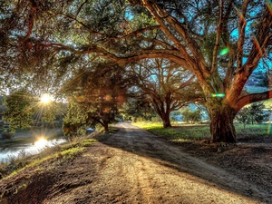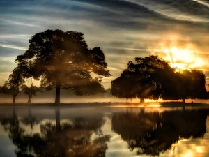 viewes, twilight, White frost, trees, Great Sunsets, grass, winter