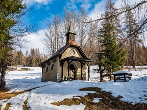 Mountains, forest, VEGETATION, trees, Path, clouds, Sky, viewes