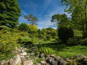 medows, trees, Way, viewes, Spring, Flowers, clouds