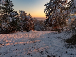 forest, trees, Windmill, viewes, Houses, snow, winter