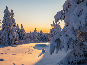viewes, lake, Norway, snow, Ringerike, trees, winter, rays of the Sun