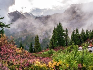 trees, forest, bridge, Yellowed, autumn, viewes, Train